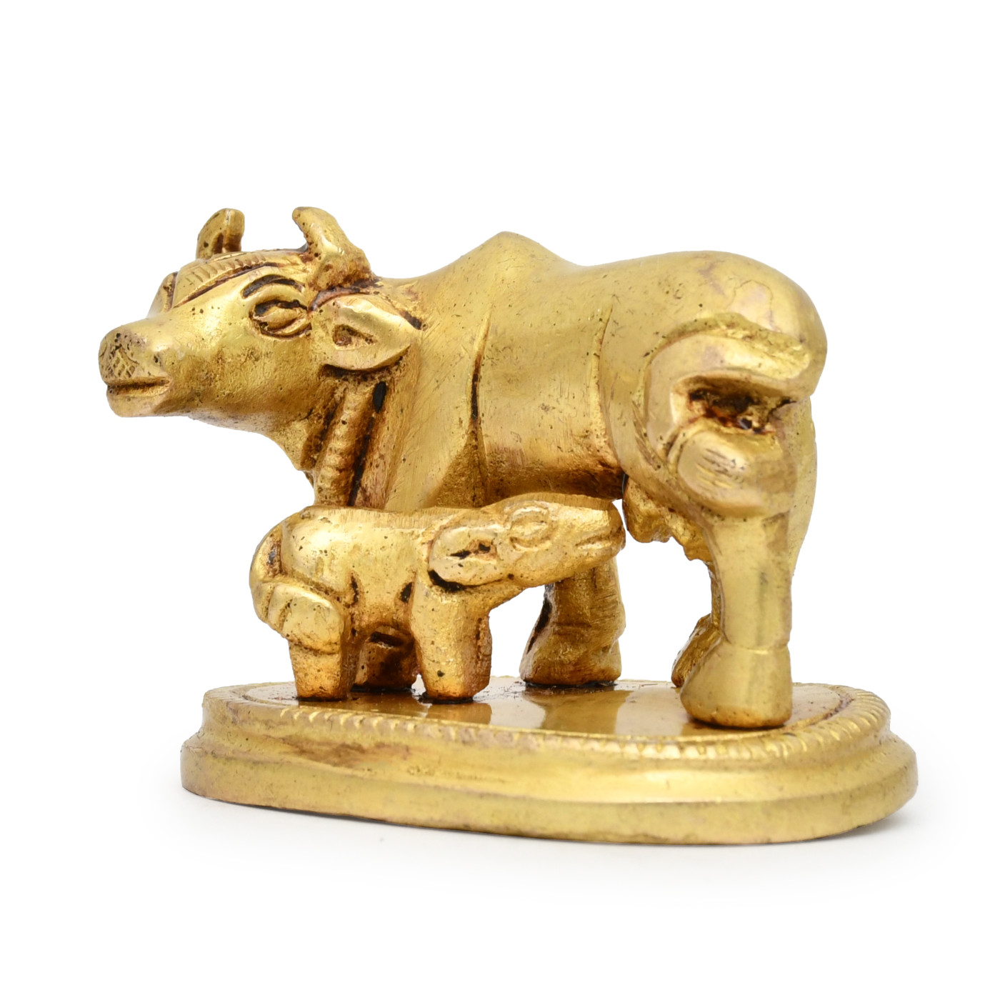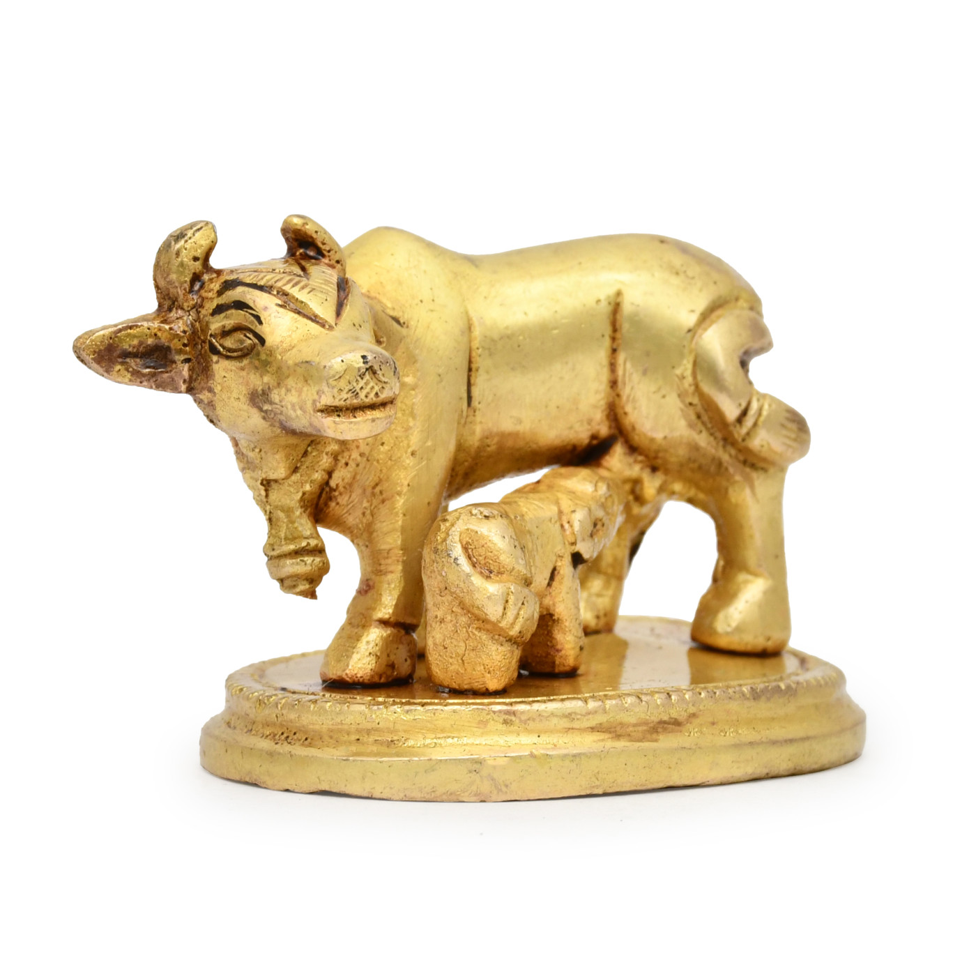 AargKraft™ Brass Golden Kamdhenu Cow with Calf, Vastu Gau MATA Idol, Spiritual Vastu Nandi Pooja Figurine Sculpture, Kamdhenu Cow & Calf Idol for Home and Office Height - 1.6 Inches Size - Small
