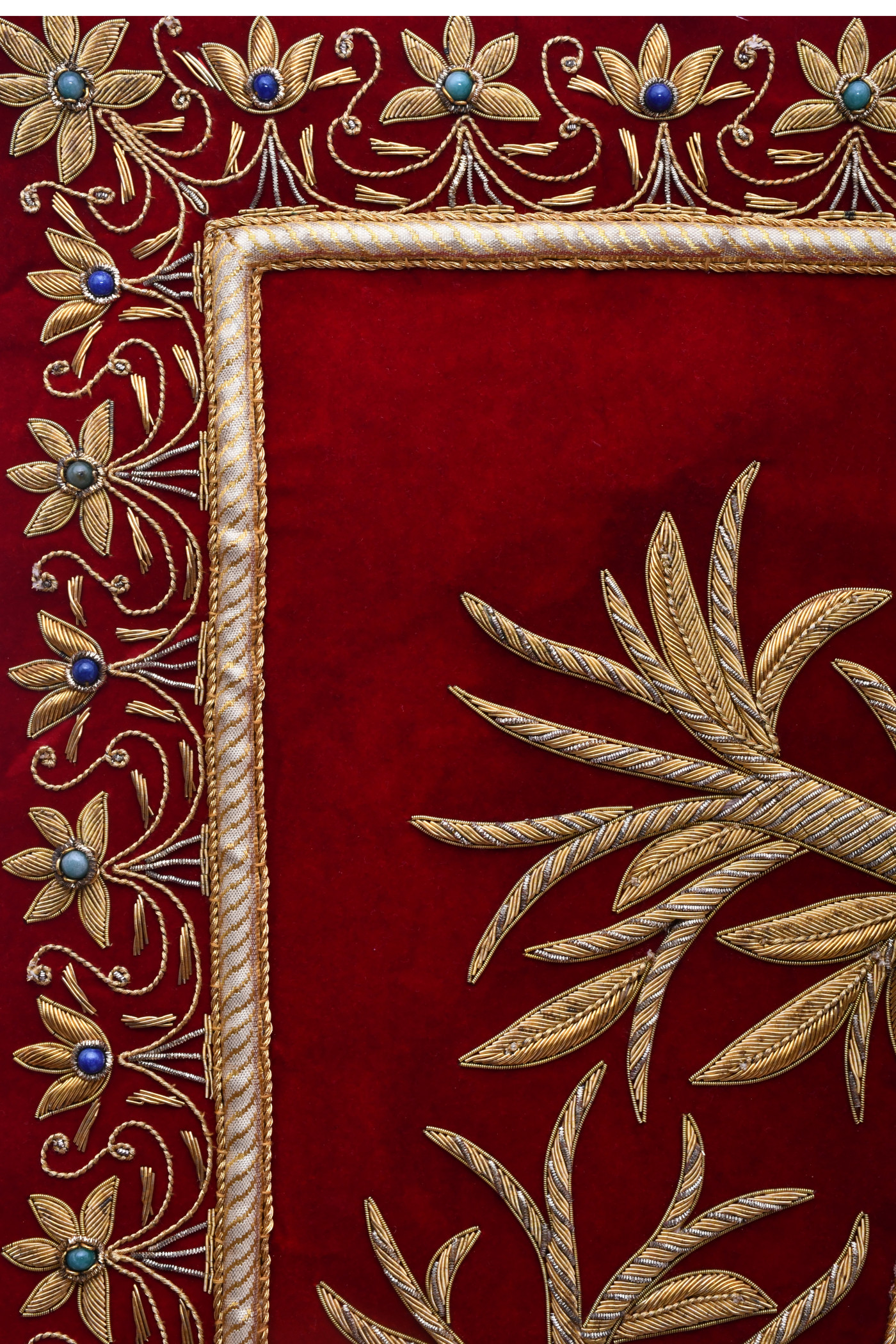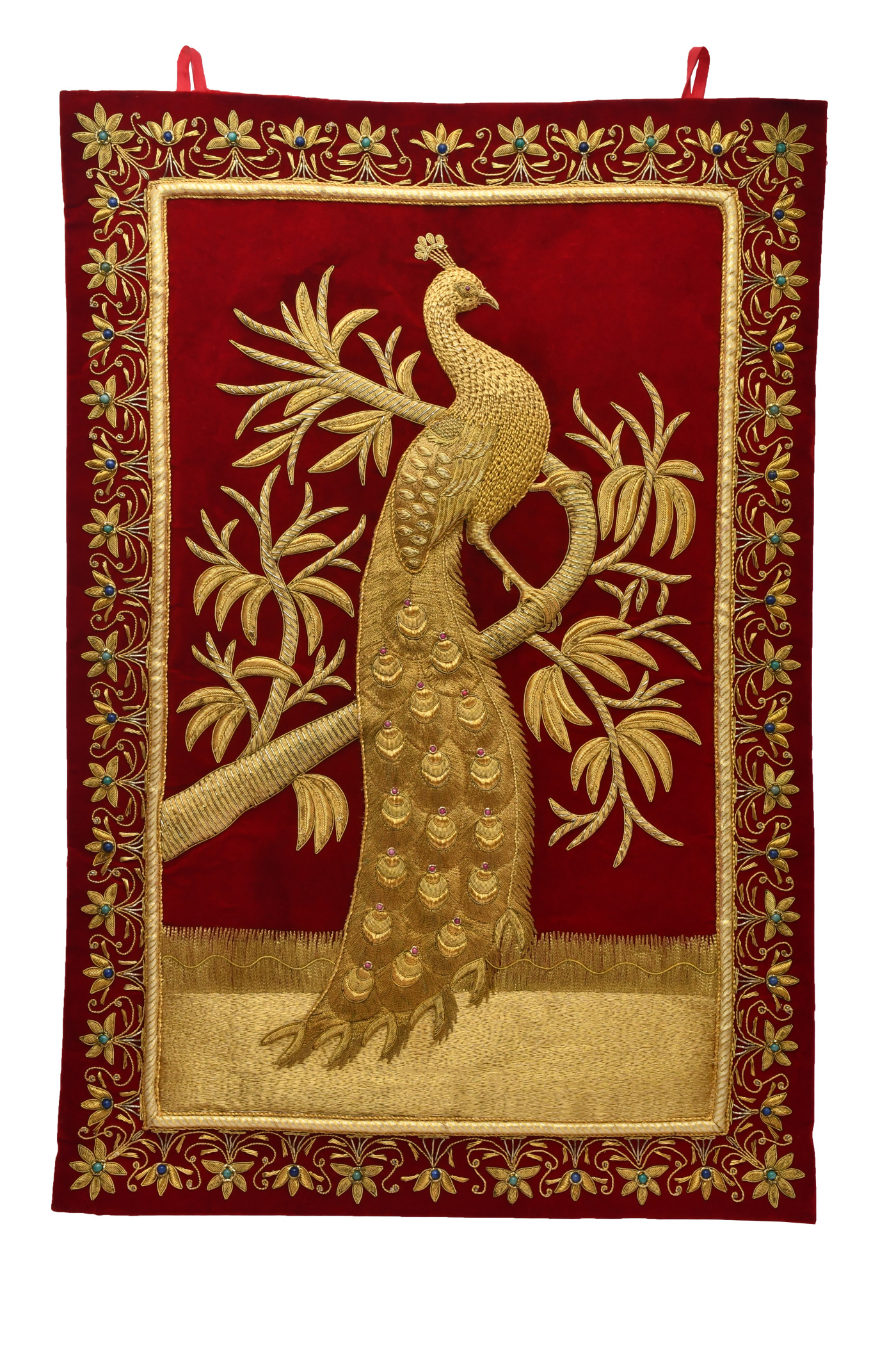 - An Absolutely Exquisite Wall Hanging studded with SEMI-PRECIOUS stones and intricate Zardozi Hand Embroidery in Gold metallic threads