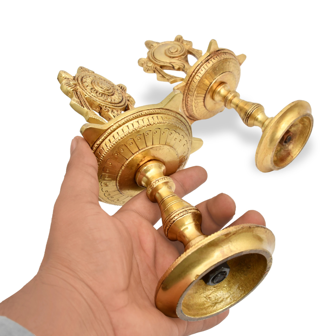 AargKraft™ Shankh Chakra Namah Design Brass Diya Oil Lamp Deepam Deepak Kuthu Vilakku Shankha Gada Padma for Pooja Home & Office Height - 9 Inches