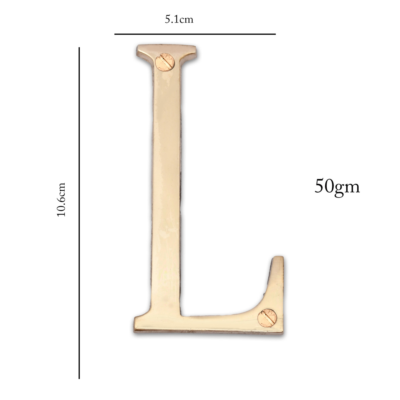- Product Details: 1 Alphabet (L) | 2 Installation Screws | Height- 4 inches | Material: Brass.