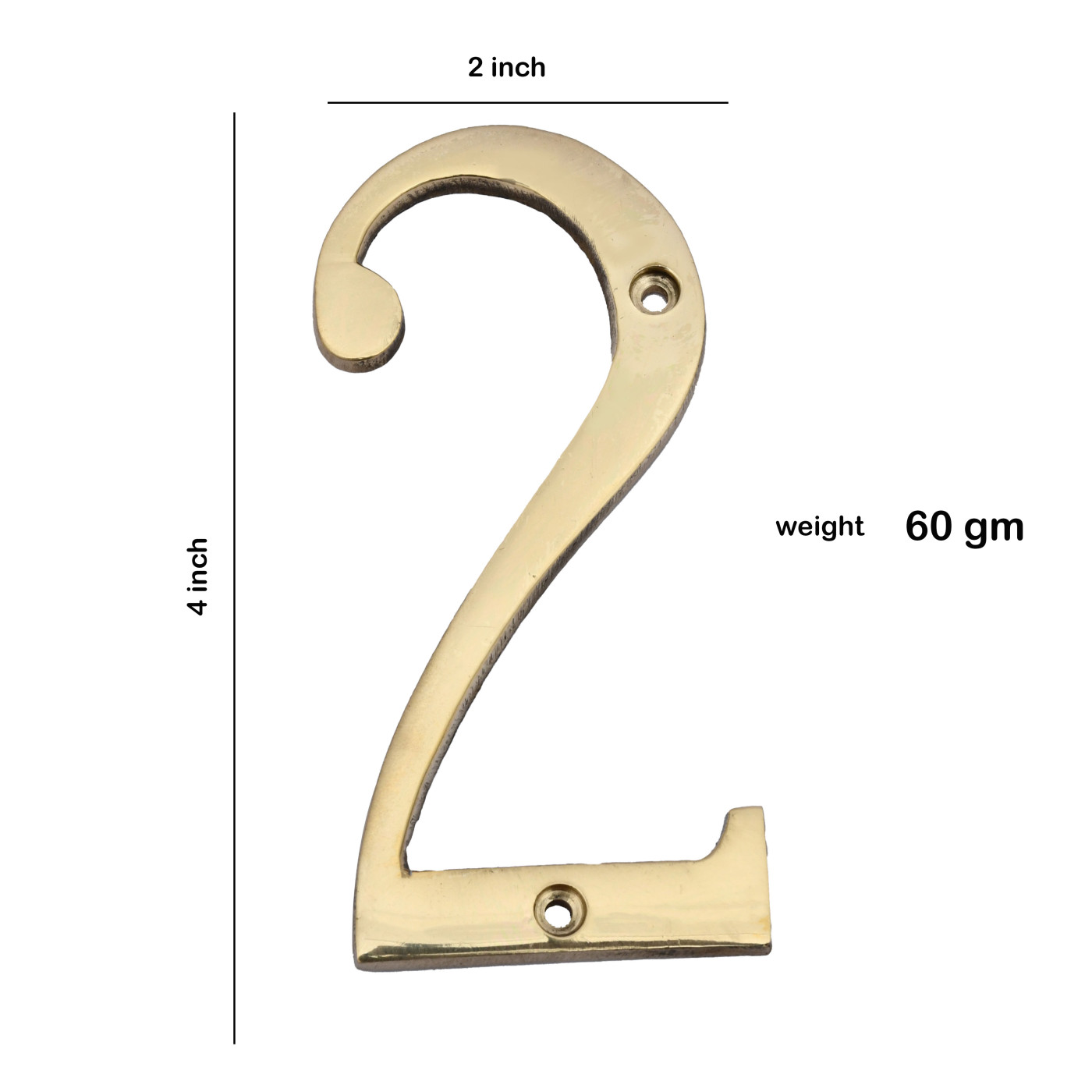 - Product Details: 1 Numeral [Digit 2], 2 Installation Screws, Size: 4 x 2 inches, Weight: 60 Gram,Material: Brass.