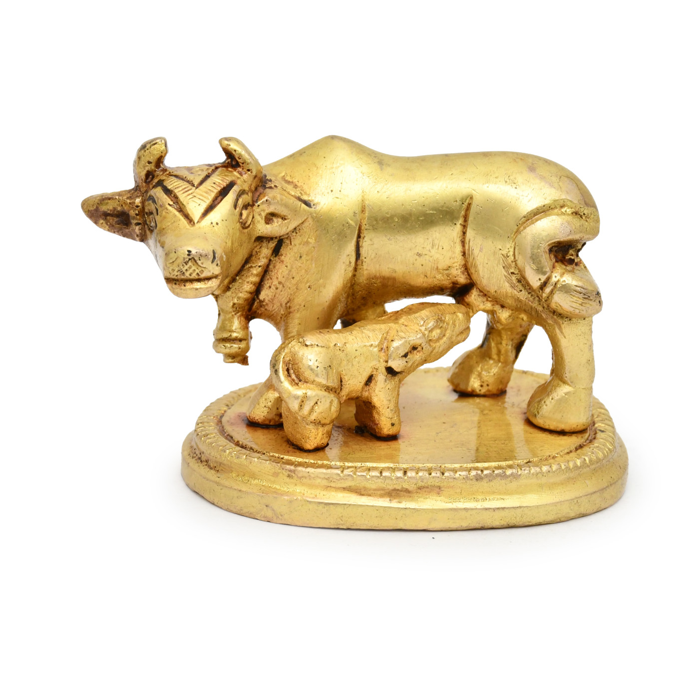AargKraft™ Brass Golden Kamdhenu Cow with Calf, Vastu Gau MATA Idol, Spiritual Vastu Nandi Pooja Figurine Sculpture, Kamdhenu Cow & Calf Idol for Home and Office Height - 1.6 Inches Size - Small