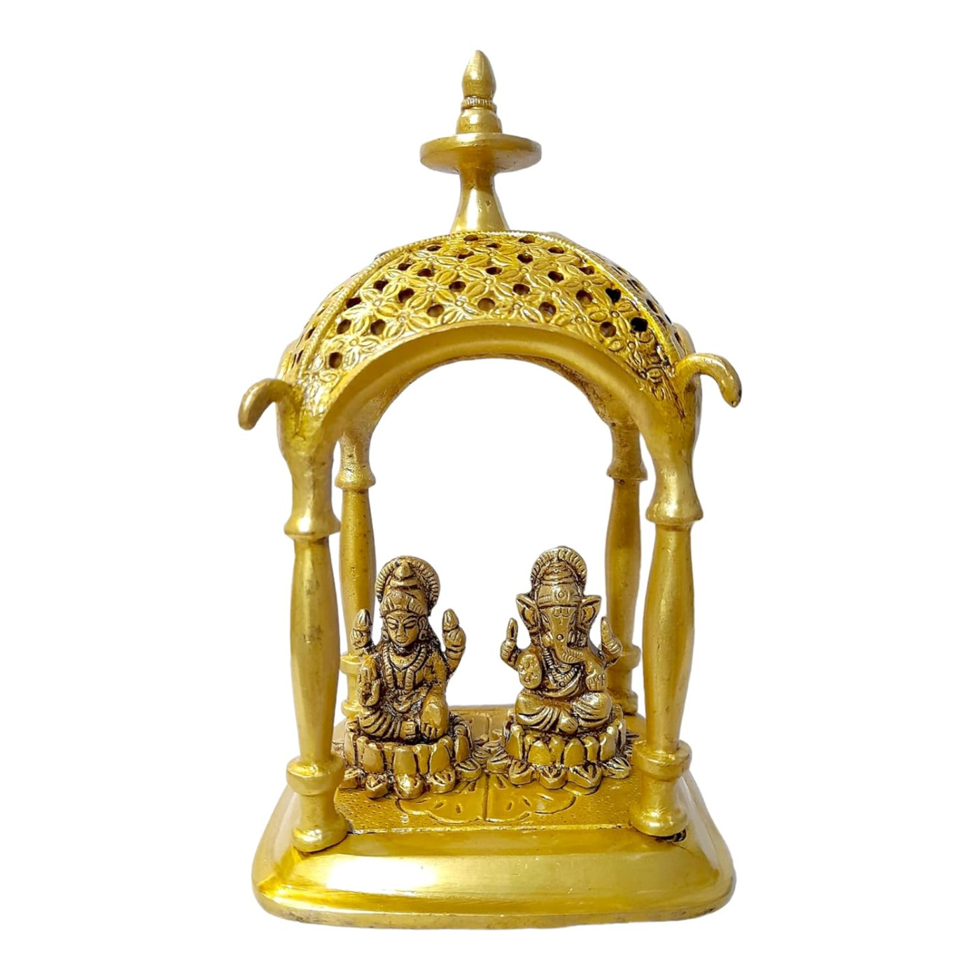 - Material: Brass | Colour: Golden | Style: Modern | Theme: Religious | Package Contents: 1 Metal Laxmi Ganesh Idol with Temple statue | Care Instruction: Clean With Dry Cloth