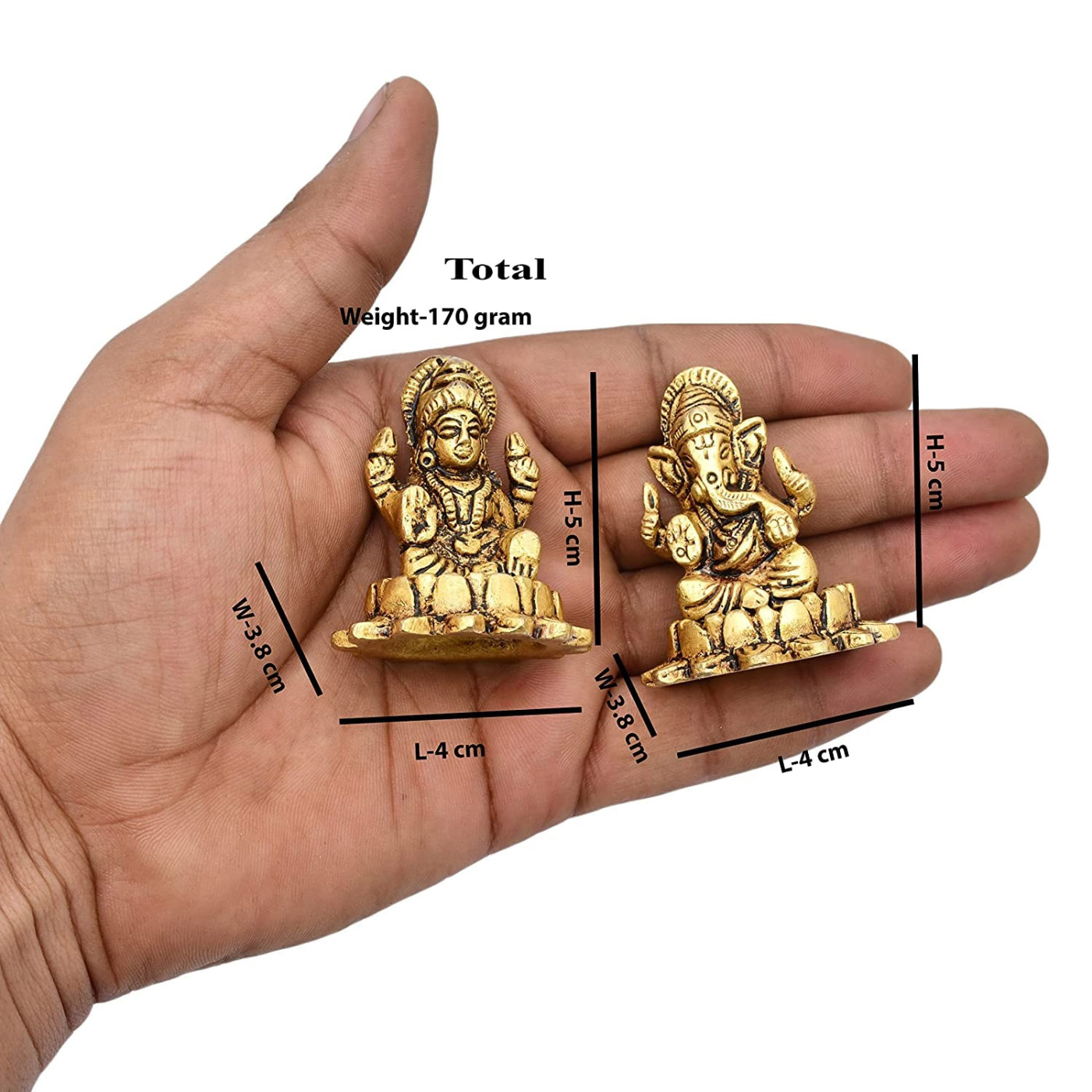 - Idol Dimensions: Length: 1.5 inches (4 cm), Width: 1.4 inches (3.8 cm), Height: 1.9 inches (5 cm), Idol Weight: Approximately 170 grams. Temple Dimensions: Length: 4 inches (10 cm), Width: 3.5 inches (9 cm), Height: 6.5 inches (16.5 cm), Temple Weight: Approximately 860 grams.