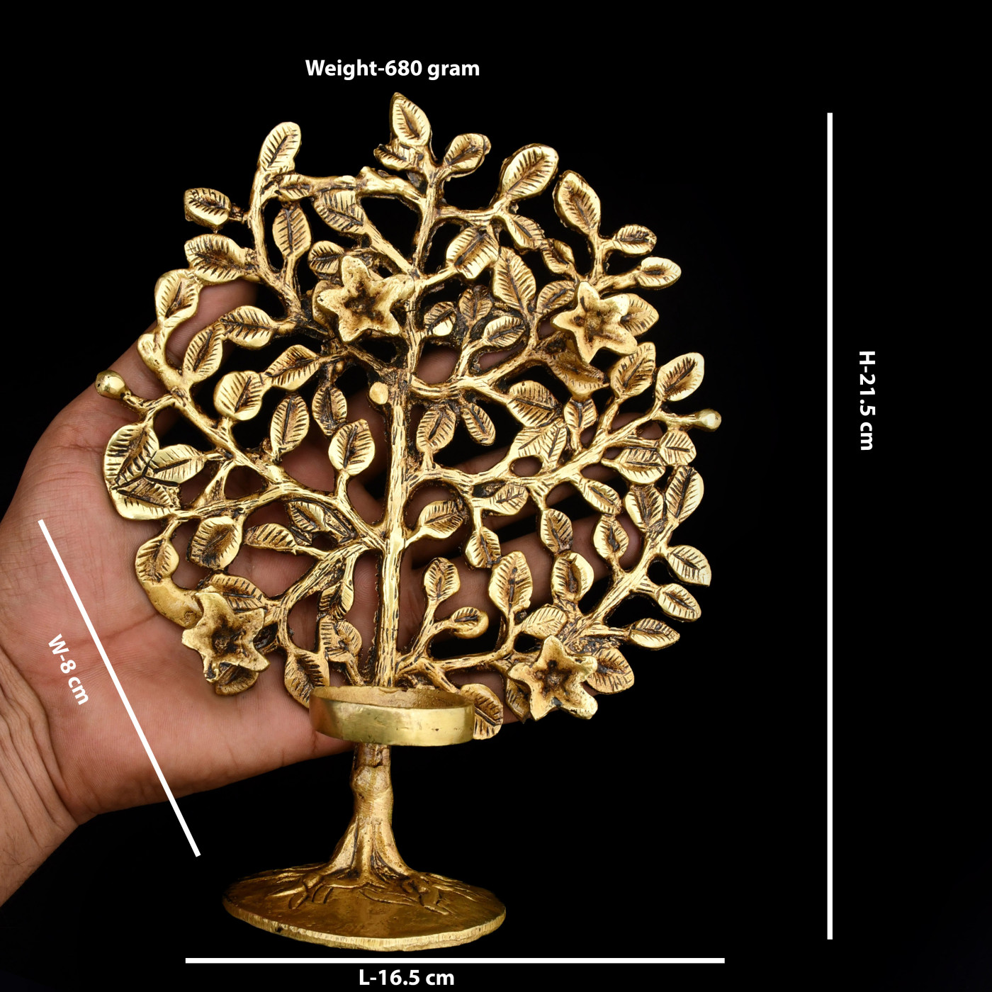 - Dimension: (L x W x H) - 6.5 inch(16.5 cm) x 3.25 inch(8.5 cm) x 8.5 inch(21.5 cm) approx, Material: Brass, Weight: 680 gram approx. This brass tree is the perfect size to display on a tabletop or mantlepiece.