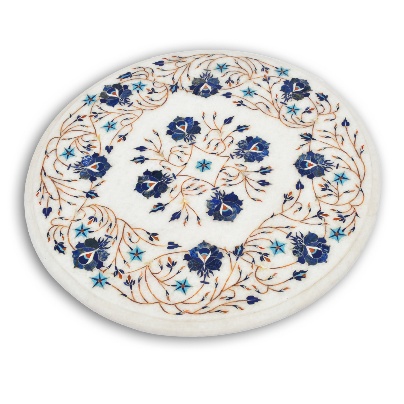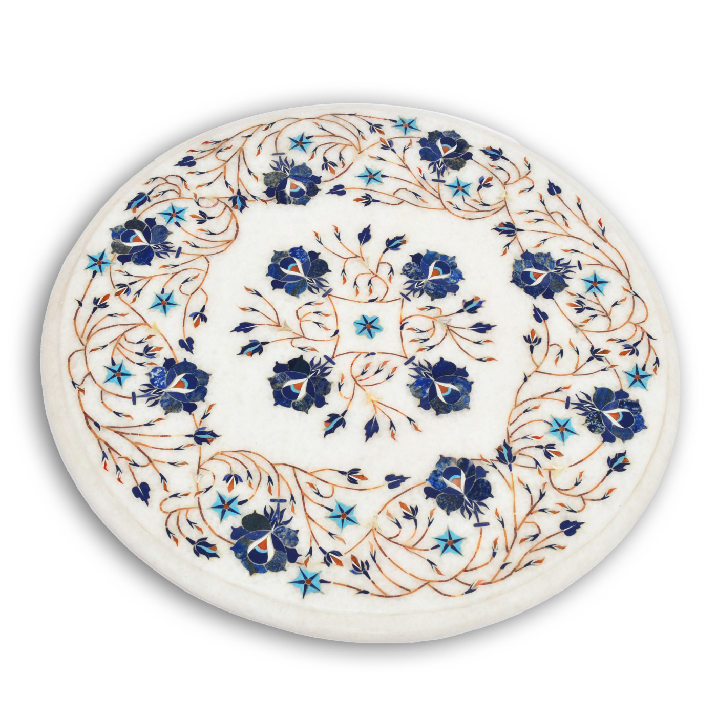 AARGKRAFT Handcrafted Marble Coffee Table Top with Intricate Inlay Work for Coffe Table | Floral Design Corner Table Top with Pietre Dura Artwork, (White, Blue)