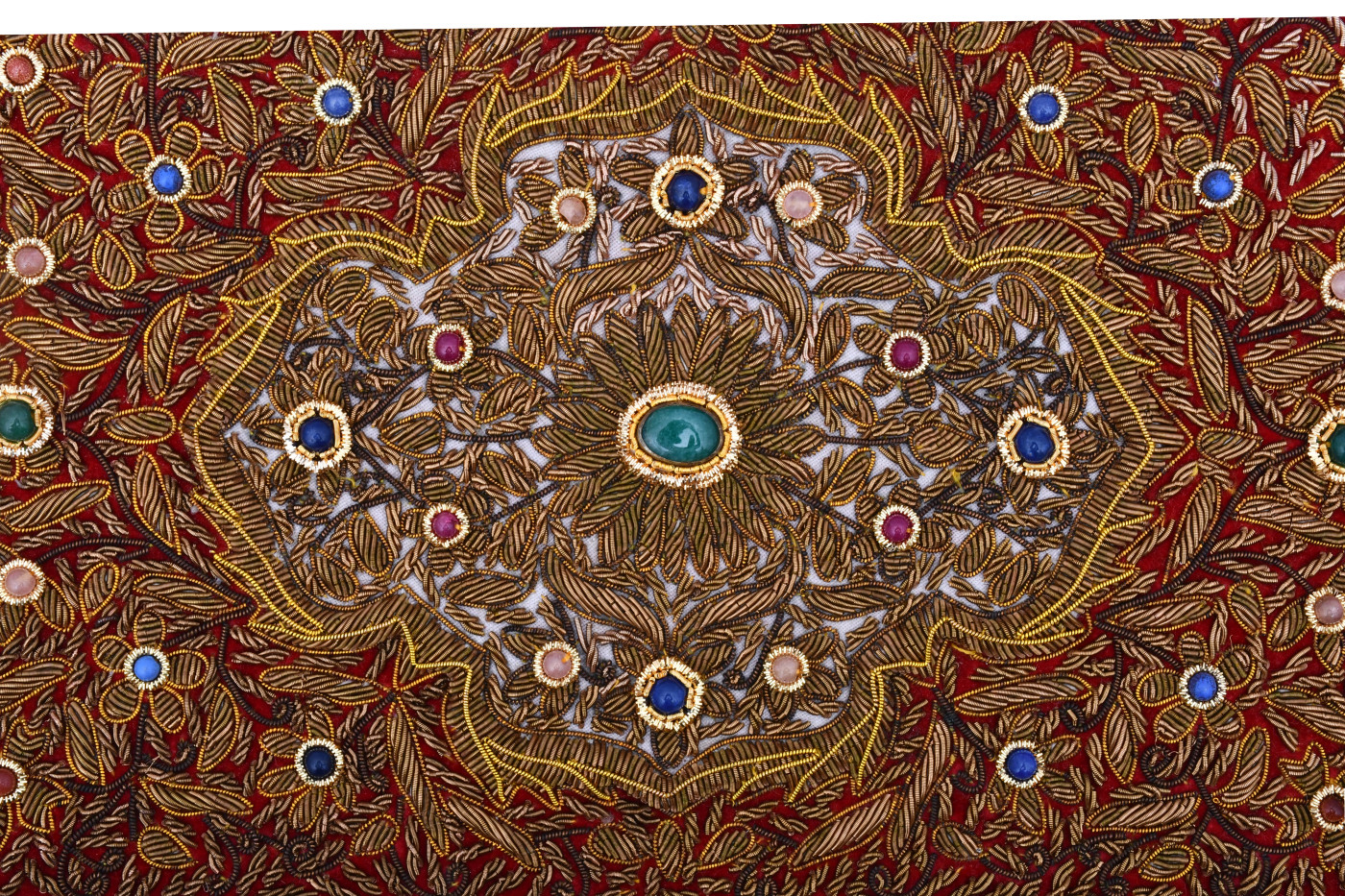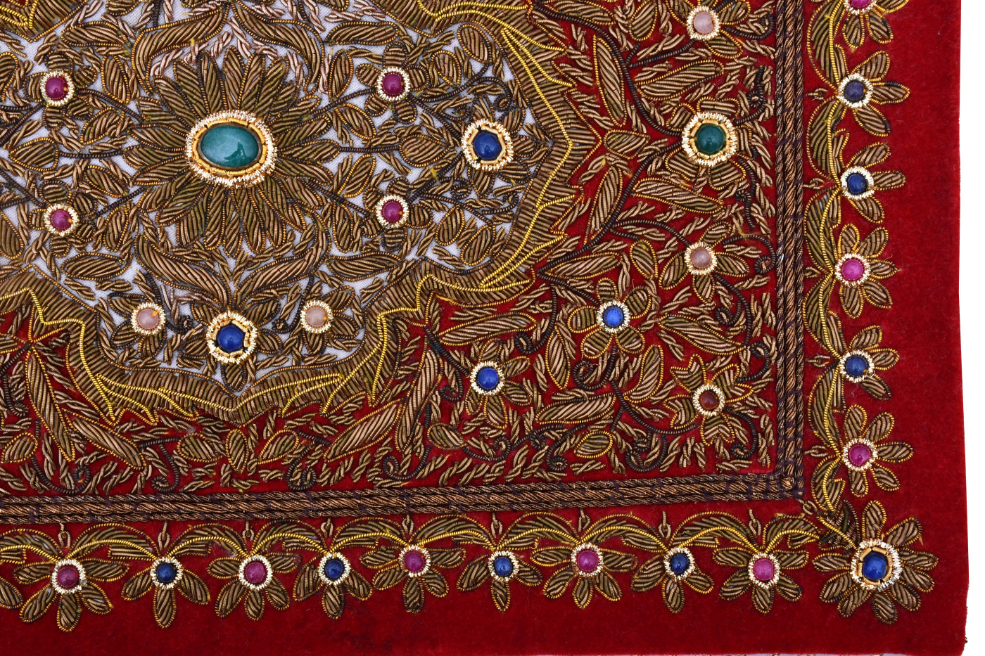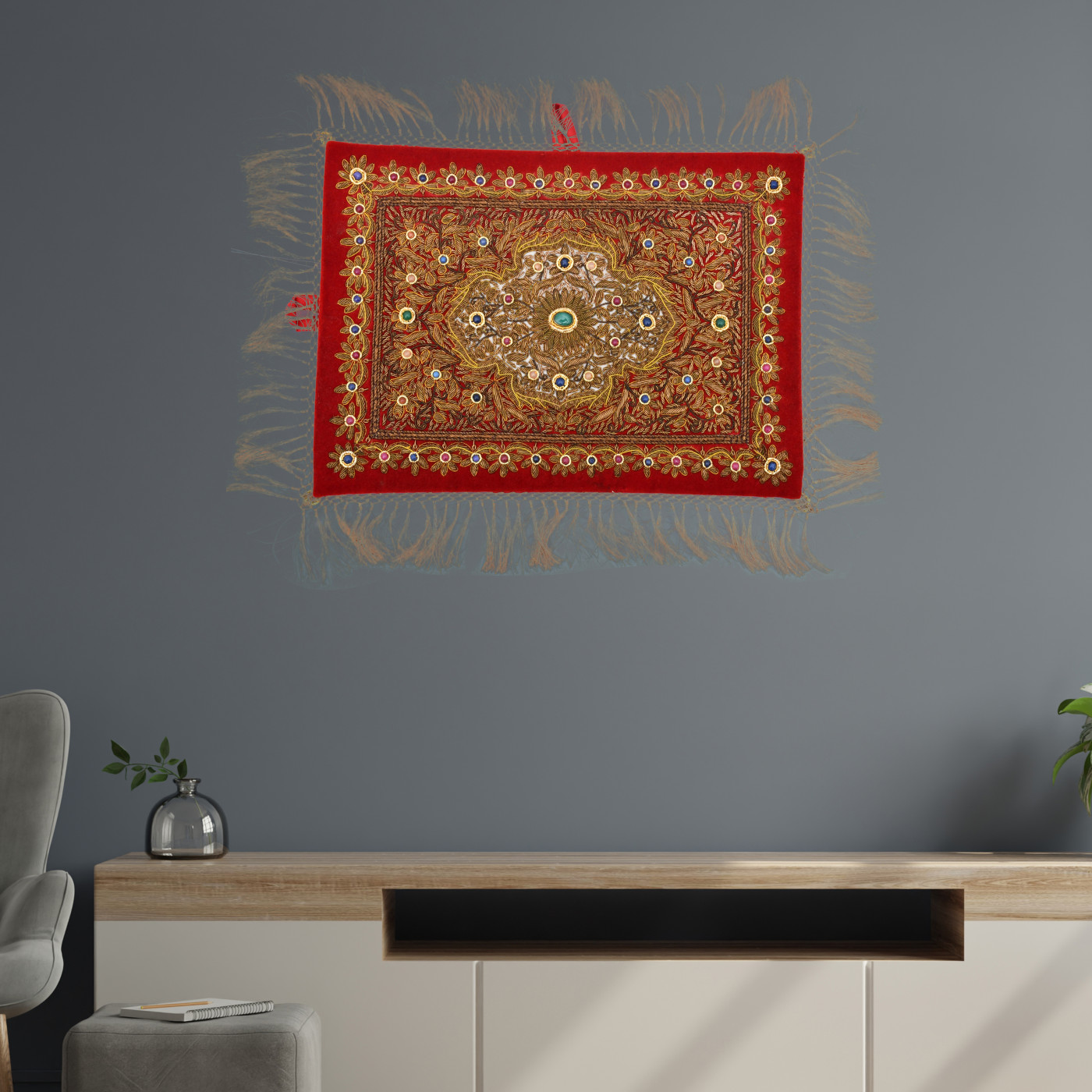 - An Absolutely Exquisite Wall Hanging studded with SEMI-PRECIOUS stones and intricate Zardozi Hand Embroidery in Gold metallic threads