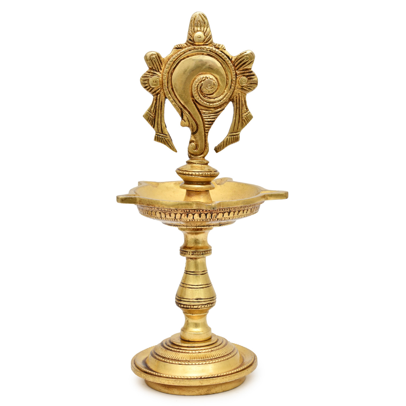 Brass Shankh Chakra Namah Design Oil Lamp Height- 9 inches, Weight- 2.1 kg approx
